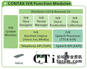 CONTAX IVR 是一個(gè)完整的媒體交換方案,可用于交互式語音應(yīng)答、文字/語音轉(zhuǎn)換、電腦電話語音整合、傳真轉(zhuǎn)遞、自動(dòng)傳真回覆 (FOD)、簡訊發(fā)送等等……