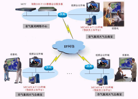 在上圖的應用案例中,DSS-T.120數(shù)據(jù)會議服務器和MCU通常放置在省氣象局網(wǎng)絡中心,視頻會議終端和預報員工作平臺(MICAPS系統(tǒng))放置在各級氣象部門的天氣會商室中。在進行遠程可視天氣會商時,系統(tǒng)通過MCU和視頻會議終端進行視頻、音頻的交互;通過DSS-T.120數(shù)據(jù)會議服務器和運行在預報員工作平臺上的T.120終端軟件進行數(shù)據(jù)的交互,各級預報員在彼此之間看到圖像聽到聲音的同時,可以看到正在做匯報的預報員共享的MICAPS系統(tǒng)中的內(nèi)容,如高空圖、地面圖、云圖等預報基礎(chǔ)素材,觀看效果如同在本地會商室一樣。在本案例中通過T.120數(shù)據(jù)會議系統(tǒng)與視頻會議系統(tǒng)的配合,可以進行視頻、音頻、數(shù)據(jù)全面的交互,真正實現(xiàn)了預報員之間"面對面"的交流。