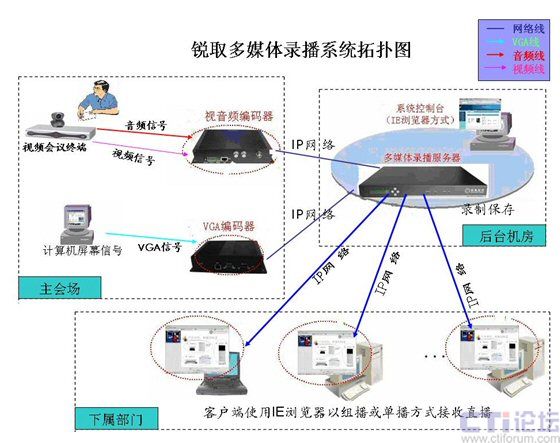 如上圖所示,硬件系統(tǒng)采用了前后臺分離的模式,前端的視音頻編碼器將從終端上采集的視音頻信號與VGA編碼器采集的VGA信號進行編碼,通過內(nèi)部專屬網(wǎng)絡傳輸?shù)胶笈_機房的錄播服務器中,通過服務器內(nèi)部功能模塊,不僅將整個會議或者培訓現(xiàn)場的視音頻與電腦桌面內(nèi)容同步錄制保存在專屬硬盤中,同時將上述采集內(nèi)容實時轉發(fā)直播到用戶局域網(wǎng)中。通過錄播系統(tǒng)的身份驗證機制,通過連接到網(wǎng)絡中的任意一臺PC即可接收直播的內(nèi)容。同時錄制保存在專屬硬盤上的內(nèi)容還可以后期點播回訪(需身份驗證)。