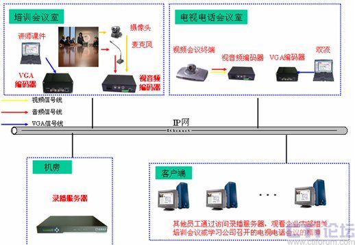 由于視頻會議系統(tǒng)沒有覆蓋公司內(nèi)所有的會議室,因此這些會議室召開的會議就無法進行直播,而借助于多媒體錄播系統(tǒng)就可以很好的解決這一缺陷。通常將這些會議室中的攝像頭和麥克風接入到視音頻編碼器上,將講師電腦上的培訓課件(如PPT,Word等文檔)內(nèi)容接入到VGA編碼器上,兩者將采集到的信號通過網(wǎng)絡(luò)發(fā)給錄播服務(wù)器,由錄播服務(wù)器進行處理后直播到各個客戶端,就可以很方面的對于任意一個會議室召開的會議進行錄播,隨時隨地對員工傳達會議精神。