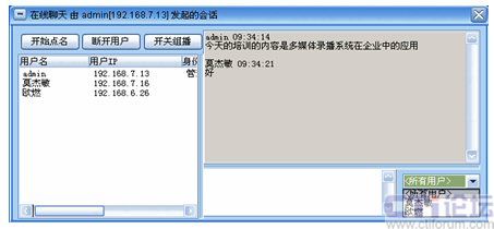 系統(tǒng)增加了多方文字互動聊天功能,在線聊天功能可以選擇給所有人員發(fā)送消息,也可以選擇給某一特定人員發(fā)送。這樣在會議或培訓的過程中,管理員可以選擇性的提出相應(yīng)的問題給相關(guān)人員,考核相關(guān)人員的培訓效果;其他人員也可以將會議或培訓過程中遇到的疑問、難點及時的反應(yīng)給管理員進行解答,增強會議的成效。