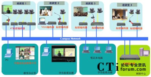 在南洋理工的商學院中有一個培訓中心,培訓中心中有4個培訓課室。 商學院的老師們希望可以把這4培訓課室中的培訓課程錄制下來,并可以同時直播到其它教室。老師可以監(jiān)控這4個培訓課室的培訓情況。學生可以使用PC通過校園網(wǎng)收看到實時的培訓情況,及培訓后的回放他們可能錯過了的培訓。系統(tǒng)可與NTU現(xiàn)有的E_learning系統(tǒng)無縫融合,為為豐富E_learning的課件資源提供低成本、高效率的制作手段。同時系統(tǒng)應該便于維護及用戶界面友好,而且便于以后的擴容。因培訓室的功能差異,每一間培訓室內所需記錄的信號類型及數(shù)量均不相同,要求系統(tǒng)能夠進行匹配和適應。