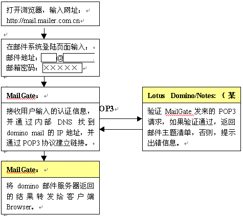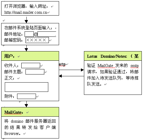 金笛郵件網(wǎng)關完全基于B/S架構的設計,使得郵件收發(fā)、管理都是基于瀏覽器完成,客戶端只要打開IE瀏覽器即可,無需做任何設置,大大方便了用戶。也就是說,在城域網(wǎng)任一節(jié)點,都可以通過內部域名(DNS)訪問郵件網(wǎng)關,然后通過郵件網(wǎng)關與用戶所在的domino郵件服務器通訊,將郵件主題、郵件內容顯示在web頁面上。金笛?郵件網(wǎng)關的具體工作流程如下: