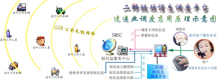二郎腿短信息調(diào)度平臺是利用目前社會上大眾普遍擁有手機的現(xiàn)成資源,通過移動通訊公司提供的短信息服務(wù)功能作為通信信道,直接對手機進行低層操作控制,以“收發(fā)短信息”的方式來實現(xiàn)信息的傳遞(通信資費標(biāo)準與在手機上收發(fā)短信相同)。調(diào)度平臺還對每條發(fā)出的信息的接收狀態(tài)進行跟蹤,確保信息能被安全