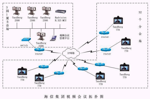 山東海信集團有限公司會議電視項目以海信大廈為中心,覆蓋各個省的35個分支機構(gòu)。充分利用自己網(wǎng)絡(luò)資源的優(yōu)勢,采用ITU(國際電聯(lián))的H。323標準。于-2004-年初經(jīng)過系統(tǒng)方案的征集、產(chǎn)品的反復測試,最終確定了由華夏科技代理的挪威TANDBERG的視頻終端,并于2004年6月份簽訂了一期采購合同,共計36套視頻終端。