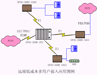 tyutSPAS-2000可編程交換機(jī)通過E1可以支持多個(gè)遠(yuǎn)端模塊。遠(yuǎn)端模塊采用SPAS-2000 SAS框,可以帶多種用戶接口:普通模擬用戶、DDN、環(huán)路中繼用戶;通過SPAS-2000 DTS對(duì)外提供各種信令接入。適合多點(diǎn)接入組網(wǎng),組網(wǎng)成本低廉。 在示意圖中,SAS表示遠(yuǎn)端用戶接入框,它可以通過需要選擇接入模擬用戶:FXO/FXS、E/M、普通模擬用戶和DDN。中心為SPAS可編程交換機(jī),可以通過 SS7/PRA/R2MF進(jìn)行匯接轉(zhuǎn)換。