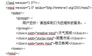 下面是一個(gè)VoiceXML簡(jiǎn)單例子。當(dāng)用戶與電話語(yǔ)音系統(tǒng)接通以后,將會(huì)聽到語(yǔ)音合成的提示"用戶您好!請(qǐng)選擇我們?yōu)槟峁┑姆⻊?wù):" 。當(dāng)用戶說"股票市場(chǎng)"