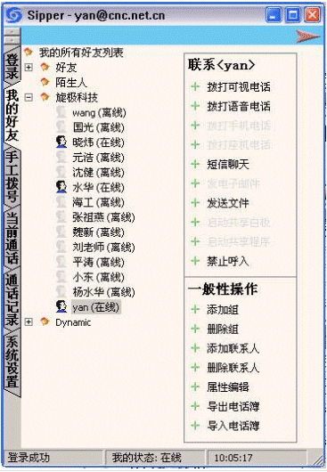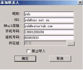 可以在這里進(jìn)行所給的各項(xiàng)操作,選擇添加聯(lián)系人,輸入某個(gè)用戶的各項(xiàng)個(gè)人信息,確認(rèn)后,這個(gè)用戶就會被添加到相應(yīng)的組中,并且會顯示出該用戶狀態(tài)。
