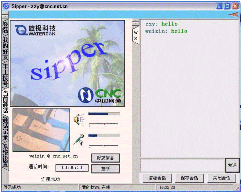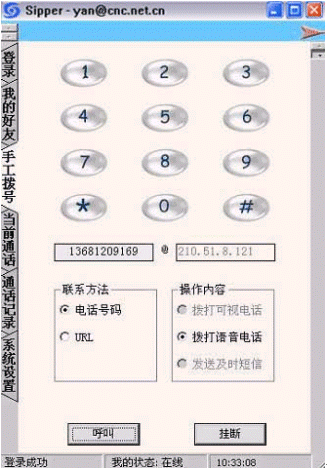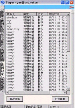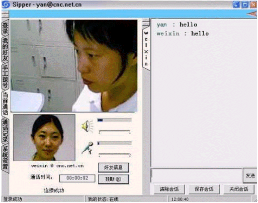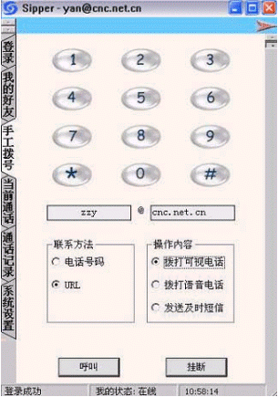 點(diǎn)擊后會出現(xiàn)對話窗口,同時(shí)在對方的機(jī)器上會出現(xiàn)你的呼叫請求,如果對方"接收"了你的請求,則兩個(gè)人的語音對話開始,雙方可以互相聽到聲音,沒有圖象,可以同時(shí)進(jìn)行短信交流。
