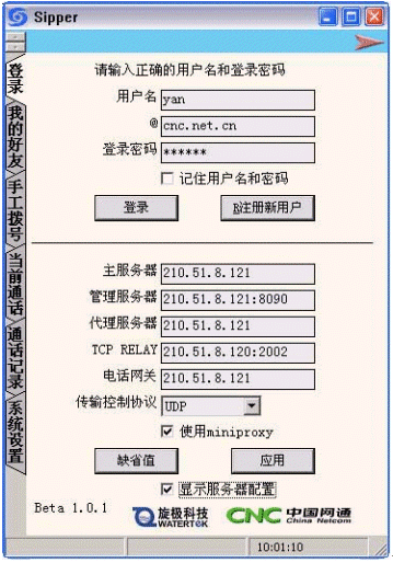 在主界面上選擇"注冊新用戶",這時(shí)會出現(xiàn)網(wǎng)通的注冊界面,選擇"開始注冊",然后將各項(xiàng)用戶信息填寫清楚后,創(chuàng)建用戶,成功后即可回到sipper界面登陸。
