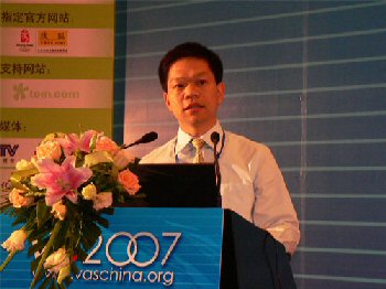 下圖為普天東方通信股份有限公司交換網(wǎng)絡(luò)事業(yè)部副總經(jīng)理張勝作主題為“融合型業(yè)務(wù)網(wǎng)絡(luò)和電信級(jí)增值平臺(tái)”的演講。