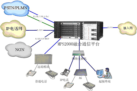 MPS2000融合通信平臺組網(wǎng)能力強大,能夠提供數(shù)字中繼、模擬中繼(包括環(huán)路中繼、二/四線中繼等各種模擬中繼)、IP中繼等硬件接口,在信令協(xié)議上支持NO.7、NO.1、Pri等信令以及H.323、SIP、MGCP等協(xié)議。平臺能夠與數(shù)字網(wǎng)、模擬網(wǎng)、數(shù);旌途W(wǎng)、IP電話網(wǎng)、NGN(下一代網(wǎng)絡(luò))等現(xiàn)有的各種網(wǎng)絡(luò)進行組網(wǎng)。
