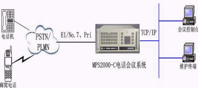 三、如果用戶現(xiàn)有通信網(wǎng)和數(shù)據(jù)網(wǎng)都不完善或不具備,則MPS2000音頻橋可以通過數(shù)字中繼或模擬中繼與公網(wǎng)相連,建設(shè)自己的電話會(huì)議系統(tǒng)。