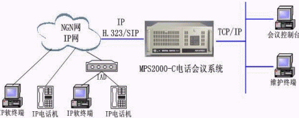系統(tǒng)提供IP接口與NGN或企業(yè)IP數(shù)據(jù)網(wǎng)相連,用戶可通IP軟件終端、IP電話會(huì)議終端、IP電話機(jī)參加會(huì)議。