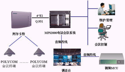 國(guó)電中心的音頻電話會(huì)議系統(tǒng)采用MPS2000電話會(huì)議系統(tǒng)。MPS2000電話會(huì)議系統(tǒng)通過(guò)4個(gè)E1與阿爾卡特的4400交換機(jī)相連,采用Pri信令,用戶通過(guò)POLYCOM的會(huì)議終端機(jī)參加會(huì)議;MPS2000電話會(huì)議系統(tǒng)通過(guò)音頻四線與調(diào)音臺(tái)相連,并通過(guò)調(diào)音臺(tái)與視頻MCU相連,同時(shí)MPS2000電話會(huì)議系統(tǒng)通過(guò)以太網(wǎng)與其內(nèi)部的局域網(wǎng)相連,同時(shí)在局域網(wǎng)內(nèi)設(shè)置一臺(tái)維護(hù)終端用于對(duì)系統(tǒng)的維護(hù)管理,會(huì)議控制臺(tái)通過(guò)WEB方式對(duì)會(huì)議進(jìn)行控制。