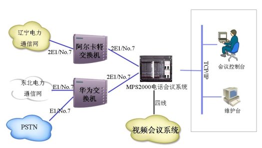 東北電網(wǎng)公司的電話會議系統(tǒng)中的120方會議橋通過4個E1采用中國七號信令與其原有的PABX相連,同時會議橋通過以太網(wǎng)與公司的內部局域網(wǎng)相連,并在局域網(wǎng)內設置一臺維護終端用于對系統(tǒng)的維護管理,局域網(wǎng)內另一臺計算機可作為會議控制臺。電話會議終端直接與PABX相連。