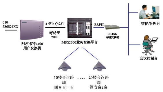 該會議系統(tǒng)通過4個數(shù)字中繼,與國電原有的阿爾卡特4400用戶交換機互連,通信采用Q.931信令。4路4線實現(xiàn)會議終端的接入,現(xiàn)使用3路,1路接國電10樓的調音臺,2路接20樓的調音臺,實現(xiàn)會議室擴音設備的接入。通過以太網(wǎng)口與D-LINK網(wǎng)絡交換機互連,接入國電集團的局域網(wǎng),實現(xiàn)維護管理及會議控制等功能。國電集團的會議接入號為:010-586826XX,因原有交換機的功能局限,以該接入號到交換機后自動呼轉到2010進入MPS2000會議系統(tǒng),實現(xiàn)會議的呼入。