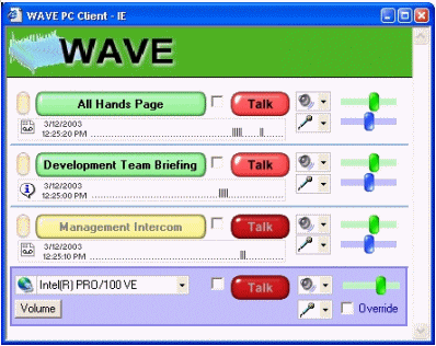 WAVE的使用方式為:管理員在服務(wù)器端建立IP電話會(huì)議,參加者使用本地計(jì)算機(jī)作為客戶端,通過(guò)耳機(jī)和麥克風(fēng)即可加入會(huì)議。一臺(tái)普通的奔四PC機(jī)可以支持?jǐn)?shù)千個(gè)會(huì)議,每個(gè)會(huì)議也允許數(shù)百個(gè)用戶參加。管理員可以分配用戶不同的權(quán)利:如講話,主持會(huì)議等等。