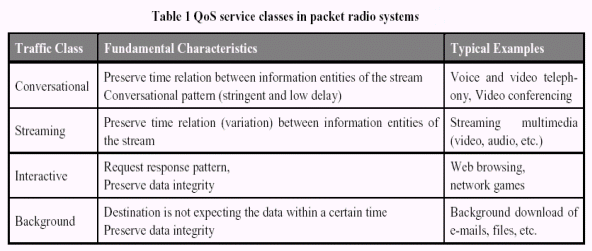 3G無(wú)線傳輸堆棧通常由二種不同類型的輸送介質(zhì)組成,專用和共享信道。然而,使用專用信道用戶可以獲得固定帶寬用于傳輸數(shù)據(jù),但使用共享信道用戶只有在動(dòng)態(tài)的帶寬下傳輸數(shù)據(jù),類似于ATM或GSM GPRS。HSDPA將會(huì)成為共享信道在空中的一個(gè)擴(kuò)展。除了MMS,在3G系統(tǒng)的初始階段所有的流媒體和會(huì)話應(yīng)用都希望使用專用信道。 在現(xiàn)代的系統(tǒng)設(shè)計(jì)中,一個(gè)應(yīng)用可以請(qǐng)求許多不同的服務(wù)質(zhì)量(QoS)級(jí)別的其中之一。服務(wù)質(zhì)量級(jí)別包含最大誤碼率、最大延遲和最大保證的帶寬等參數(shù)。此外,通常根據(jù)不同的應(yīng)用分為不同的服務(wù)級(jí)別:會(huì)話應(yīng)用、流媒體應(yīng)用、交互應(yīng)用以及后臺(tái)通信應(yīng)用。特性和典型的例子見(jiàn)表1。