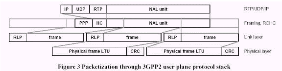 因?yàn)榘粨Q服務(wù),3GPP/3GPP2同意了一個(gè)基于IP的協(xié)議棧。圖3展示了一個(gè)NAL單元通過(guò)3GPP2用戶平面協(xié)議堆棧被封裝在RTP/UDP/IP的典型過(guò)程。在頭壓縮(RoHC)后,此IP/UDP/RTP包被封裝進(jìn)一個(gè)PDCP/PPP2包,變成了頻率鏈路控制(RLC)和服務(wù)數(shù)據(jù)單元(SDU)。RLC協(xié)議可以在三種模式下工作:透明、非確認(rèn)和確認(rèn)模式。RLC協(xié)議為用戶和數(shù)據(jù)提供分段和重傳服務(wù)。在透明和非確認(rèn)模式,RLC被定義為單向的;在確認(rèn)模式,RLC被定義為雙向的。對(duì)於所有的RLC模式,循環(huán)冗余檢查(CRC)的錯(cuò)誤檢測(cè)在物理層上被運(yùn)行,而且CRC檢查的結(jié)果和真實(shí)的數(shù)據(jù)一起被遞送到 RLC。在透明模式中,沒(méi)有上層的協(xié)議被增加到較高層的數(shù)據(jù)中。錯(cuò)誤的協(xié)議數(shù)據(jù)單元(PDUs)可以被丟棄或標(biāo)記為錯(cuò)誤。在非確認(rèn)模式中,沒(méi)有重傳協(xié)議在使用中,而且數(shù)據(jù)傳送沒(méi)有保證。接受到的錯(cuò)誤數(shù)據(jù)根據(jù)配置來(lái)決定丟棄或標(biāo)記為錯(cuò)誤。在確認(rèn)模式中,一種自動(dòng)的重復(fù)請(qǐng)求機(jī)制被用于錯(cuò)誤訂正。