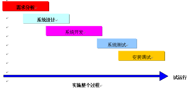 系統(tǒng)實(shí)施分階段進(jìn)行,大致分為需求分析、系統(tǒng)設(shè)計(jì)、系統(tǒng)開發(fā)、系統(tǒng)測(cè)試、安裝調(diào)試、試運(yùn)行及驗(yàn)收。實(shí)施的具體時(shí)間表應(yīng)有雙方單位根據(jù)實(shí)際情況商議確定。