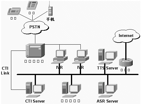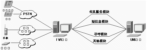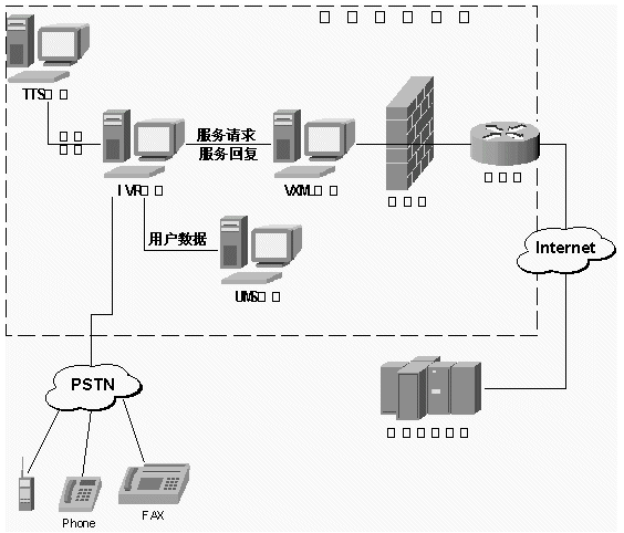 TTS系統(tǒng)、VXML系統(tǒng)、UMS系統(tǒng)與已有IVR(電話(huà)語(yǔ)音自動(dòng)應(yīng)答系統(tǒng))平臺(tái)、Internet、PSTN結(jié)合的示示意圖如下: