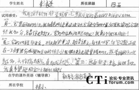 CTI論壇(ctiforum)1月21日消息(記者 潘婷婷):2010年12月,科大訊飛在天津市的兩所小學(xué)舉辦了暢言互動(dòng)英語(yǔ)學(xué)生版試用體驗(yàn)活動(dòng),同學(xué)們積極參與,在校園內(nèi)掀起了一股練聽(tīng)力、學(xué)口語(yǔ)的英語(yǔ)學(xué)習(xí)熱潮。通過(guò)實(shí)際試用體驗(yàn),暢言互動(dòng)英語(yǔ)學(xué)生版學(xué)習(xí)產(chǎn)品以其強(qiáng)大、實(shí)用的學(xué)習(xí)功能,得到了廣大家長(zhǎng)、學(xué)校師生的一致認(rèn)可和充分肯定。