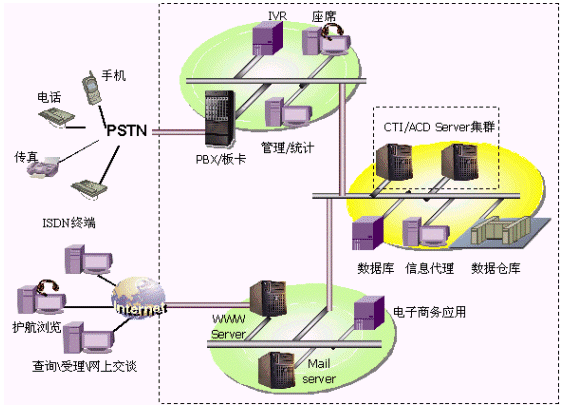 將PSTN訪問(wèn)、Internet訪問(wèn)有機(jī)結(jié)合,對(duì)傳統(tǒng)呼叫中心進(jìn)行擴(kuò)充,支持多種接入方式,多種交流渠道,具有傳統(tǒng)呼叫中心無(wú)法比擬的優(yōu)越性。