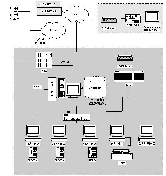 北京強(qiáng)訊恒通網(wǎng)絡(luò)技術(shù)公司通過利用該學(xué)院現(xiàn)有的計(jì)算機(jī)局域網(wǎng),根據(jù)該學(xué)院業(yè)務(wù)需求專門為800服務(wù)熱線設(shè)立了一組服務(wù)座席,每個座席都有座席電腦。所有撥打800熱線的電話通過CTI服務(wù)器的ACD系統(tǒng)分配到服務(wù)組最適合的座席。如該服務(wù)組暫時沒有空閑座席,則語音提示用戶等待并播放音樂,一旦有座席空閑則自動將該用戶電話轉(zhuǎn)接到空閑座席。當(dāng)有外線進(jìn)來接通到某個座席時,系統(tǒng)自動彈出該電話用戶的客戶資料。