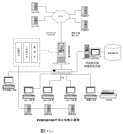 系統(tǒng)主要由計算機(jī)網(wǎng)絡(luò)、數(shù)字中繼接口、人工座席、語音處理及存儲、系統(tǒng)管理(數(shù)據(jù)庫管理+計費(fèi)管理+語音編輯)幾部分組成。如圖2·1所示: