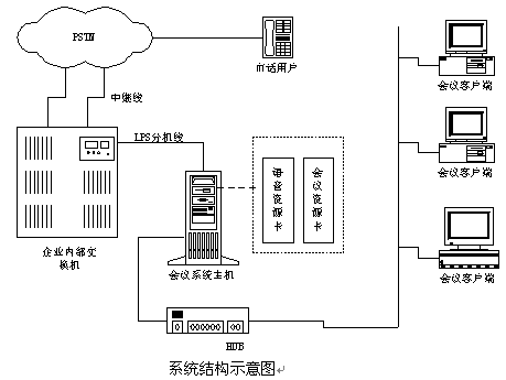 說(shuō)明:如果沒(méi)有企業(yè)內(nèi)部程控交換機(jī)則可以將中繼線(xiàn)直接接在會(huì)議系統(tǒng)主機(jī)上,中繼線(xiàn)可以是普通模擬中繼,也可以是E1接口(如中國(guó)一號(hào)信令、30B+D等)。在與會(huì)議系統(tǒng)主機(jī)的同一網(wǎng)段上可以配置多個(gè)會(huì)議客戶(hù)端系統(tǒng),通過(guò)客戶(hù)端系統(tǒng)用戶(hù)可以隨時(shí)觀(guān)察和監(jiān)視會(huì)議系統(tǒng)的使用情況,并且可以建立常用用戶(hù)的用戶(hù)資料,也可以對(duì)常用用戶(hù)進(jìn)行分組,這樣要呼叫某些用戶(hù)開(kāi)會(huì)時(shí)只需呼叫組用戶(hù)即可;