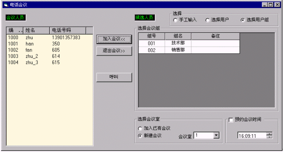 當(dāng)某個(gè)管理員想組織會(huì)議時(shí),只需點(diǎn)擊菜單"會(huì)議呼叫設(shè)置"項(xiàng),如下界面: