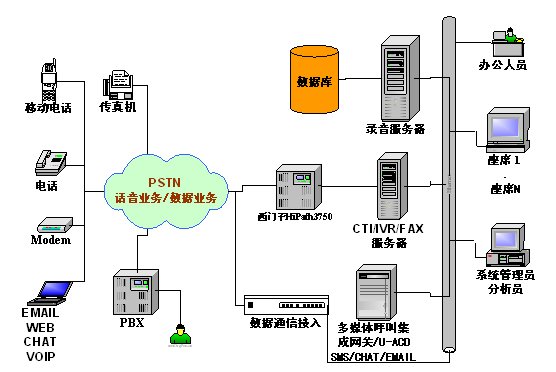 本方案采用西門(mén)子HiPath3750交換機(jī),通過(guò)強(qiáng)訊中間件控制整個(gè)呼叫中心的電話呼入、呼出。它支持多種聯(lián)絡(luò)渠道,包括語(yǔ)音、交互式自動(dòng)語(yǔ)音應(yīng)答(IVR)、傳真、短消息。