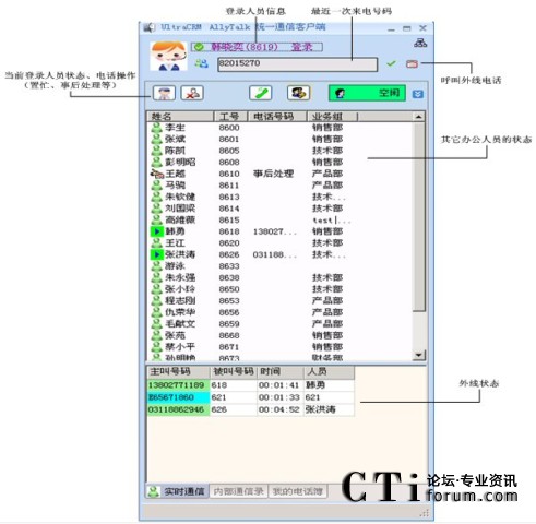 辦公人員可以通過(guò)時(shí)實(shí)電話的界面:實(shí)時(shí)監(jiān)控系統(tǒng)的呼叫隊(duì)列、其它辦公人員的工作狀態(tài);并且通過(guò)屏幕控制電話的接答、掛機(jī)、轉(zhuǎn)接,以及建立會(huì)議等操作。如下圖所示: