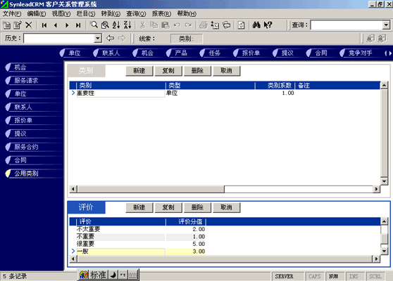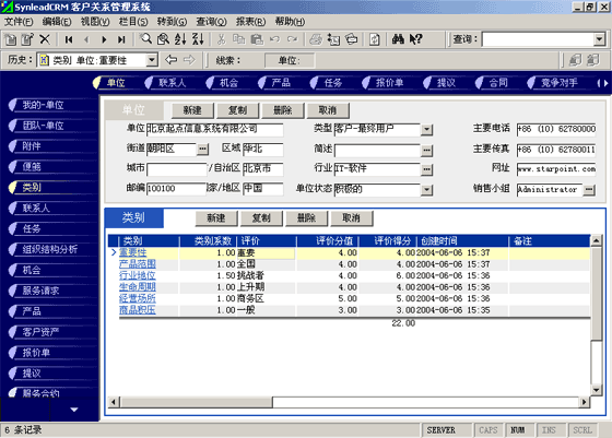 客戶單位的分類較聯(lián)系人的分類更復(fù)雜。常用的分類有:按照企業(yè)規(guī)模來分類(大、中、小,層次自定義,下同)、按照該客戶與本單位的緊密程度分類(緊密、普通、疏遠(yuǎn))、按照該客戶的重要性分類(重要、普通、次要)、按照該客戶的忠誠度分類(忠誠、普通、游移)。有一些用戶企業(yè),希望對客戶單位特征進(jìn)行采集,進(jìn)而進(jìn)行客戶信用評價。信用特征的類別可以多達(dá)數(shù)十種類(詳細(xì)情況可參考有關(guān)書籍)。利用SynleadCRM,您可以為每個類指定系數(shù),為類下屬的每個評價指定評分分值。例如,您可以建立一個類別為"客戶倉庫積壓商品的情況",系數(shù)為1,該類別下屬的評價有"很多1分"、"一般3分"、"少1分"、"未知0分",如果指定某客戶該類別的評價為一般,則該項目得分為3分*1(系數(shù))=3分。依此類推,您還可以指定更多的分類與評價,例如:客戶經(jīng)營場所所處的位置、客戶在企業(yè)生命周期中所處的位置、客戶在行業(yè)中的地位、客戶產(chǎn)品的組合情況、客戶產(chǎn)品覆蓋的市場范圍、客戶產(chǎn)品的淡旺季規(guī)律、客戶近年營業(yè)額的增減趨勢、客戶的年度營業(yè)額、客戶的現(xiàn)金周轉(zhuǎn)能力、客戶的負(fù)債情況、客戶是否涉及中大訴訟等。每一個類別項目的評分經(jīng)過系數(shù)的加權(quán)運(yùn)算后,可以求和,得到這個客戶的總評分。未來也可以利用分析模型對此類數(shù)據(jù)進(jìn)行進(jìn)一步的分析,提供輔助決策所需要的圖表和報表。