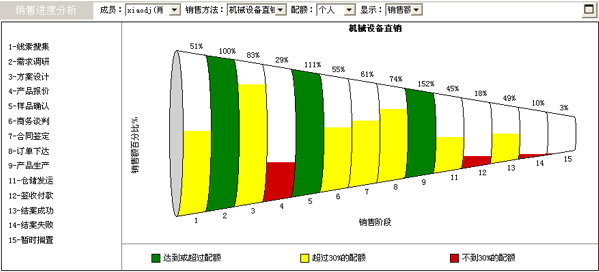 圓錐體上方每個(gè)階段都對(duì)應(yīng)一個(gè)百分比數(shù)值,表示當(dāng)前各個(gè)銷售階段的銷售額與該階段任務(wù)指標(biāo)的比率。例如假設(shè)"線索搜集"階段的任務(wù)指標(biāo)是100,000元,當(dāng)前的比率是51%,則表示當(dāng)前處于"線索收集"階段的機(jī)會(huì)的銷售額之和是51,000元。如果銷售額/任務(wù)指標(biāo)的值小于30%,則以紅色塊表示;如果值介于30%~100%則以黃色塊表示,如果值大于或等于100%,則以綠色塊表示。