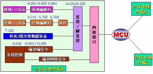 如圖所示:視頻會(huì)議終端將輸入進(jìn)來(lái)的視頻使用H.261、H.263或H.264協(xié)議、音頻使用G.711、G.722或G.728、數(shù)據(jù)、控制信令進(jìn)行單獨(dú)編碼,然后將編碼后的數(shù)據(jù)進(jìn)行“復(fù)用”打包后形成遵循網(wǎng)絡(luò)協(xié)議的數(shù)據(jù)包,通過(guò)網(wǎng)絡(luò)接口傳到MCU供選擇廣播。從MCU傳來(lái)的其他會(huì)場(chǎng)的數(shù)據(jù)包通過(guò)“解復(fù)用”,分別還原成視頻、音頻以及數(shù)據(jù)及控制信令分別相應(yīng)的輸出設(shè)備上回顯或執(zhí)行。