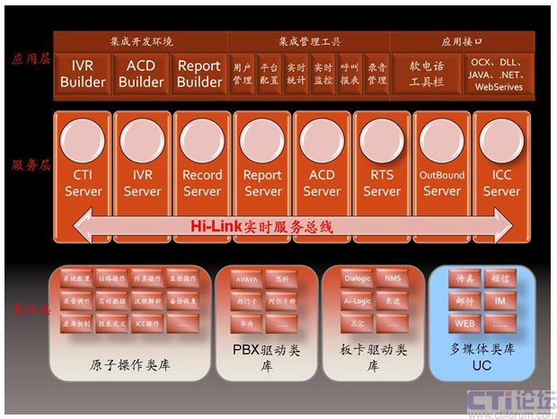 在擁有第五代呼叫中心Hi-Link核心軟件的商路通公司看來,呼叫中心軟件架構(gòu)包含三層,基礎層、服務層和應用層。而統(tǒng)一通信UC應從劃入基礎層及服務層之中,PBX驅(qū)動類庫和板卡驅(qū)動類庫處理電話媒體的請求,而多媒體類庫用于處理其他統(tǒng)一通信的媒體,如傳真、短信、電子郵件、均包含在多媒體類庫之中。傳真、短信、電子郵件等請求分別由FAX