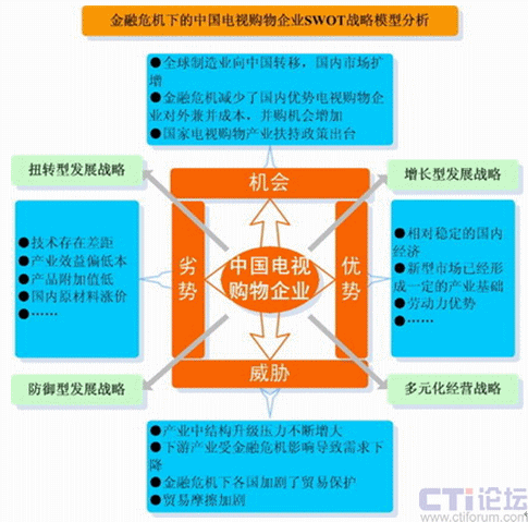 1992年至2009年以來,電視購物經(jīng)歷了從割據(jù)到統(tǒng)一,全國購物頻道網(wǎng)絡(luò)化;從粗放到科學(xué),頻道運營模式專業(yè)化;從簡介到深度,頻道編排方式規(guī)律化、從滯后到及時,物流配送體系成熟化。電視購物被譽為繼零售、超市之后的第三次銷售革命,電視購物將成為金融危機(jī)經(jīng)濟(jì)形態(tài)下未來中國電視新的經(jīng)濟(jì)增長點,而付費電視、數(shù)字網(wǎng)絡(luò)電視的發(fā)展,是中國電視購物市場新的戰(zhàn)略機(jī)會。金融危機(jī)下的中國電視購物企業(yè)SWOT戰(zhàn)略模型分析如下: