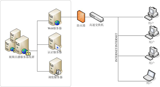 客戶可以通過訪問放置在甘肅省移動(dòng)公司面機(jī)房?jī)?nèi)的Web服務(wù)器,同時(shí)WEB服務(wù)器發(fā)送請(qǐng)求到認(rèn)證服務(wù)器,通過客戶AAA級(jí)認(rèn)證后的,客戶經(jīng)過調(diào)度服務(wù)器將請(qǐng)求反饋給視頻服務(wù)器,完成視頻點(diǎn)播流程,具體架構(gòu)如圖。