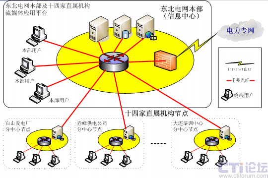針對東北電網(wǎng)有限公司的需求,系統(tǒng)采用分布式網(wǎng)絡(luò)結(jié)構(gòu),并在14個直屬分支機構(gòu)部署CDN分節(jié)點,中心機房架設(shè)一臺WEB服務(wù)器,1臺數(shù)據(jù)庫服務(wù)器,1臺流媒體服務(wù)器作為CDN中心服務(wù)器,1臺直播發(fā)布服務(wù)器、2臺直播采集工作站,14個分支機構(gòu)分別架設(shè)1臺流媒體服務(wù)器作為CDN邊緣服務(wù)器,具體配置如下: