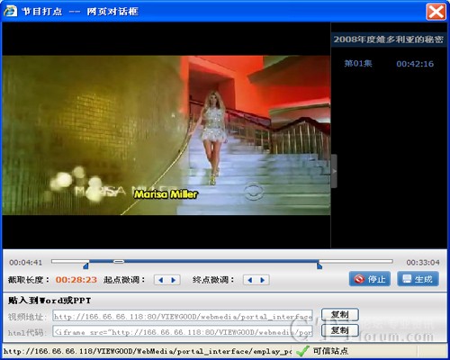 拖動進度條左右的打點按鈕可以設定片段的開始和結束時間點,還可以點擊起點微調(diào)和重點微調(diào)的左右箭頭對截取的視頻進行微調(diào),然后點擊“生成”,再點擊“復制”可以將截取的節(jié)目URL粘貼到WORD、PPT、BBS或BLOG等頁面中。