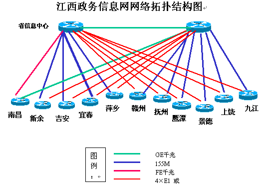 江西省于2002年8月開始實施省政務(wù)信息網(wǎng)縱向網(wǎng)省市聯(lián)網(wǎng)工程,于2002年12月底實施完畢。目前,在南昌地區(qū)已建成省級政務(wù)核心網(wǎng)及政務(wù)專網(wǎng),省委、省政府、省人大、省政協(xié)及一百多個省直部門,已通過光纜實現(xiàn)了橫向網(wǎng)絡(luò)互聯(lián)。