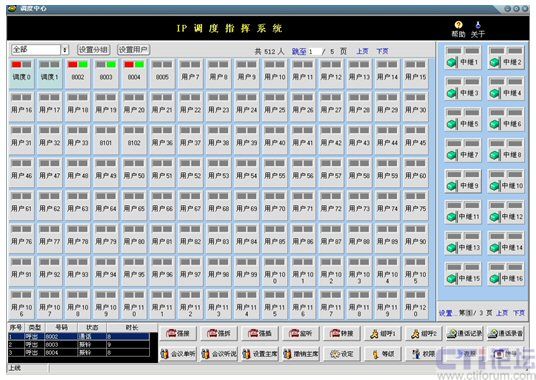 在此界面中實現(xiàn)了配置管理功能和呼叫相關功能。配置管理分為:設置、修改和刪除分組,設置用戶,設置中繼,翻頁等功能;呼叫相關功能:強接、強拆、強插、監(jiān)聽、轉接、組呼、設定等級、設定權限、設定夜服、會議相關等功能。另外,可以在本軟調度系統(tǒng)中檢索瀏覽相關通話記錄,并可對錄音進行回放。