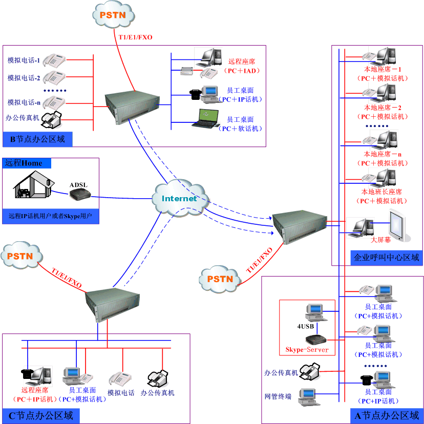 各區(qū)域內(nèi)部員工可以進(jìn)行0話費(fèi)的通話和傳真外,還可以非常輕松的實(shí)現(xiàn)長途旁路功能 (即長途費(fèi)用變市話費(fèi)用功能);同時每部分機(jī)同時具有一個真實(shí)的當(dāng)?shù)厥性捥柎a和一個內(nèi)部分機(jī)號。