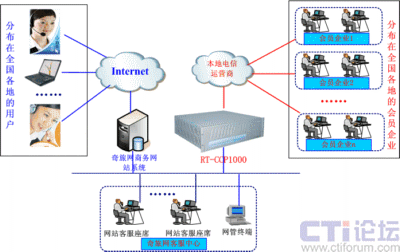 融天科技采用自主研發(fā)的融合通信平臺(tái)RT-CCP1000設(shè)備一套為奇旅網(wǎng)部署了一套Web-call聯(lián)絡(luò)中心。RT-CCP1000集傳統(tǒng)PBX、IP-PBX、CTI、IVR、DB、VOIP、錄音、傳真等服務(wù)于一體,以模塊化的形式提供用戶(hù)所需的各種功能,是一套功能強(qiáng)大的一體化融合通信平臺(tái),安裝部署非常方便,維護(hù)管理非常簡(jiǎn)單。該方案中,與本地電信運(yùn)營(yíng)商采用數(shù)字中繼E1接口和模擬中繼FXO接口方式連接,軟電話(huà)以控件方式嵌入到奇旅網(wǎng)公司的商務(wù)網(wǎng)站上, RT-CCP1000將接收所有以該控件方式來(lái)至Internet來(lái)的呼叫,并通過(guò)與電信運(yùn)營(yíng)商接口呼叫相關(guān)會(huì)員企業(yè)綁定的聯(lián)絡(luò)電話(huà),這樣就實(shí)現(xiàn)了上網(wǎng)用戶(hù)通過(guò)電腦與會(huì)員企業(yè)免費(fèi)進(jìn)行直接聯(lián)絡(luò)。網(wǎng)絡(luò)拓?fù)鋱D如下: