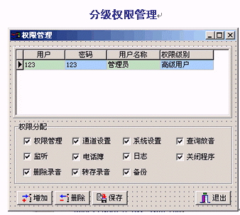 。。通話錄音或留言進(jìn)行查詢管理,可按日期、時(shí)間、電話號(hào)碼、線路、通話長度、人員等條件對錄音進(jìn)行快速檢索、播放,也可將錄音文件進(jìn)行刪除、標(biāo)記、轉(zhuǎn)存、備份等操作。分級(jí)權(quán)限管理