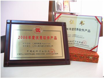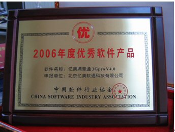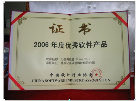 2006年1月18日,由中國軟件行業(yè)協(xié)會頒發(fā)的“2006年度推薦優(yōu)秀軟件產(chǎn)品”獎,經(jīng)過層層評審,終于浮出水面。北京億美軟通科技有限公司推薦的面向3G應用的移動商務產(chǎn)品——億美滿意通3Gpro憑借著不俗的表現(xiàn)喜獲殊榮。
