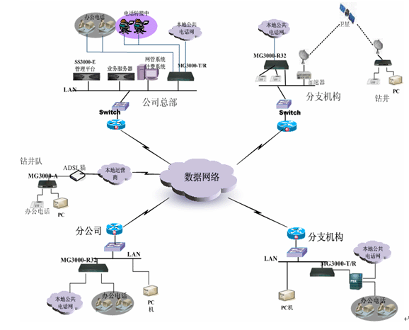 對(duì)規(guī)模比較小的辦事處,或者遠(yuǎn)端的鉆井隊(duì),一般在本地都是采用ADSL接入這樣方式,這樣情況可以直接配置MG3000-A語音往關(guān),實(shí)現(xiàn)語音數(shù)據(jù)同傳方式。MG3000-A提供1、4、8口多種方式供實(shí)際情況來選擇。所有的號(hào)碼可以直接在總部中心的平臺(tái)來分配控制。