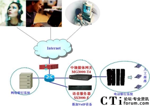 通過上述三環(huán)節(jié),Internet上的電話呼叫即可送入電話銀行的人工座席處,Internet上的客戶也就可以通過計算機上的耳麥和電話銀行座席人員通話。拓?fù)涫疽鈭D如下: